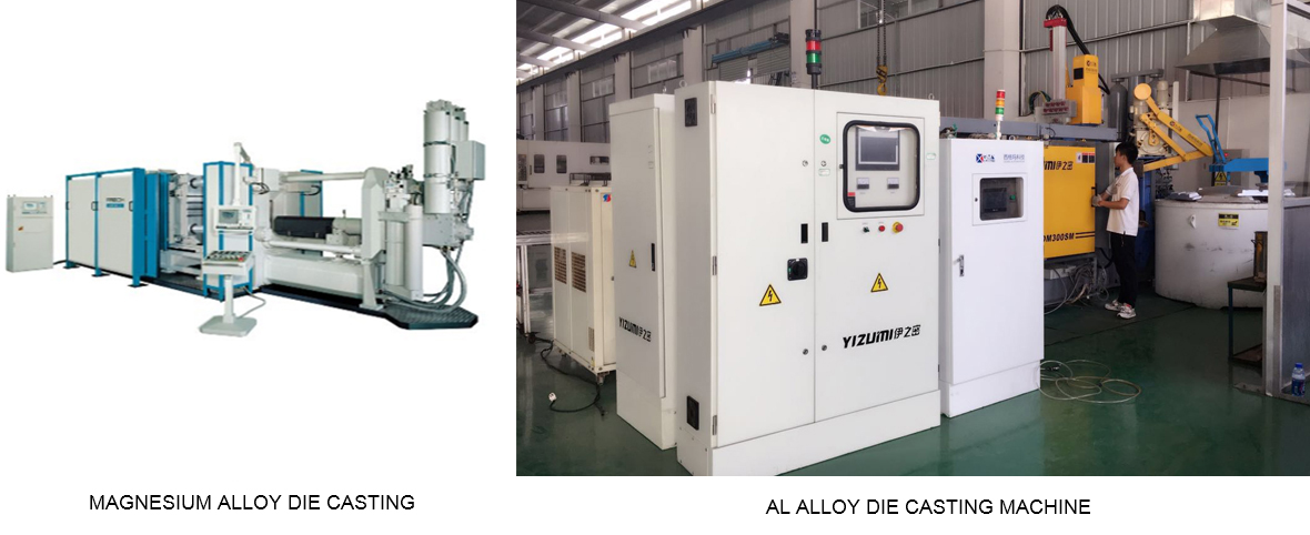 It is common process, Mg /Al alloy light metal material such as heated till full liquid and injected into the metal mold with high speed and high pressure for forming. SF6 as protective gas.